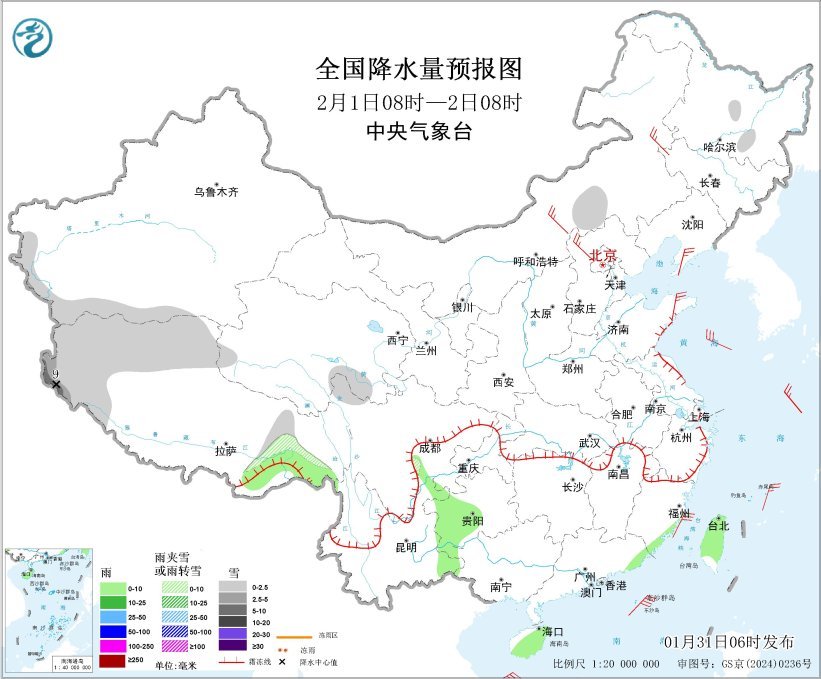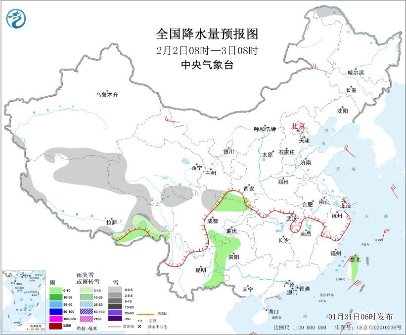 全国降水量预报图(1月31日08时-2月1日08时)。图片来源:中央气象台网站